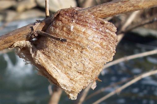 Praying Mantis nests are sometimes attached to the limbs of pines. They prefer white pines. Shaking the tree will not remove the nest. You must manually look for and remove the nest. Put the nest outside in your garden or flower garden so they can hatch in the spring. They are good for your garden since they do not eat plants. They will feed upon the insects in your garden. If you do not remove the nest, they will hatch in the warmth of your home and you will have hundreds of little green mantis’s.